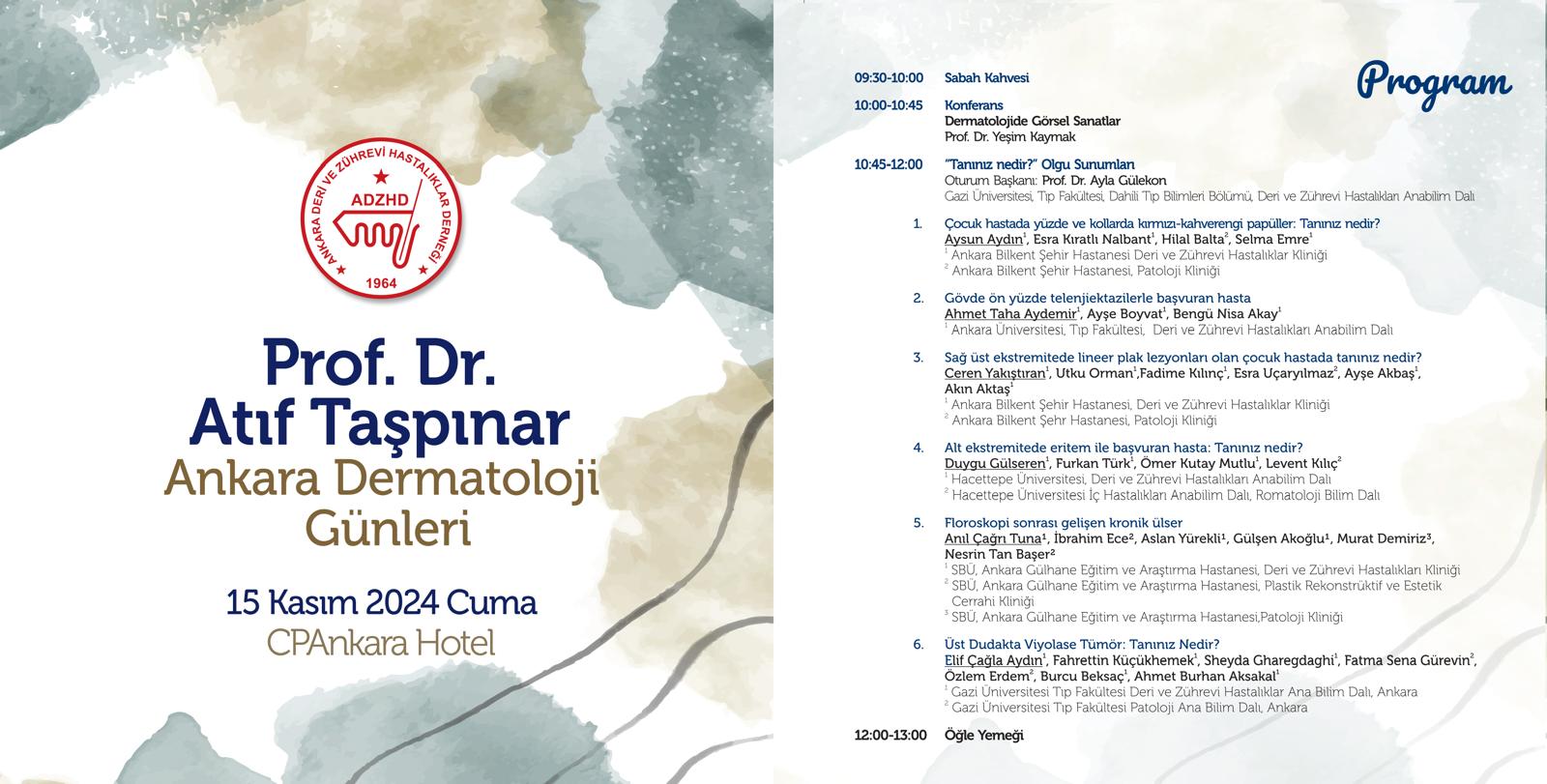 Prof. Dr. Atıf Taşpınar Ankara Dermatoloji Günleri 15 Kasım 2024 tarihinde CPAnkara Hotel'de düzenlenecektir.