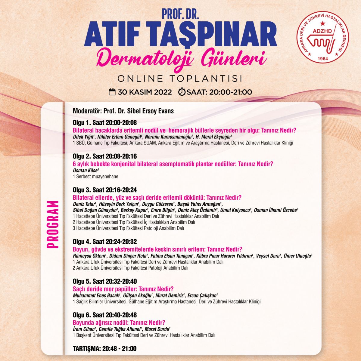 30 Kasim 2022 aksam saat 20 00-21 00 saatleri arasinda Prof Dr Atıf Taşpınar günleri çevrimiçi olarak düzenlenecektir. Sunulacak olgular ile ilgili bilgilendirme e-postalarının dernek@ankaraderm.org adresine gonderilmesi gerekmektedir. Erişim Linki: https://join.livecasthq.com/atiftaspinardermatolojionline30kasim